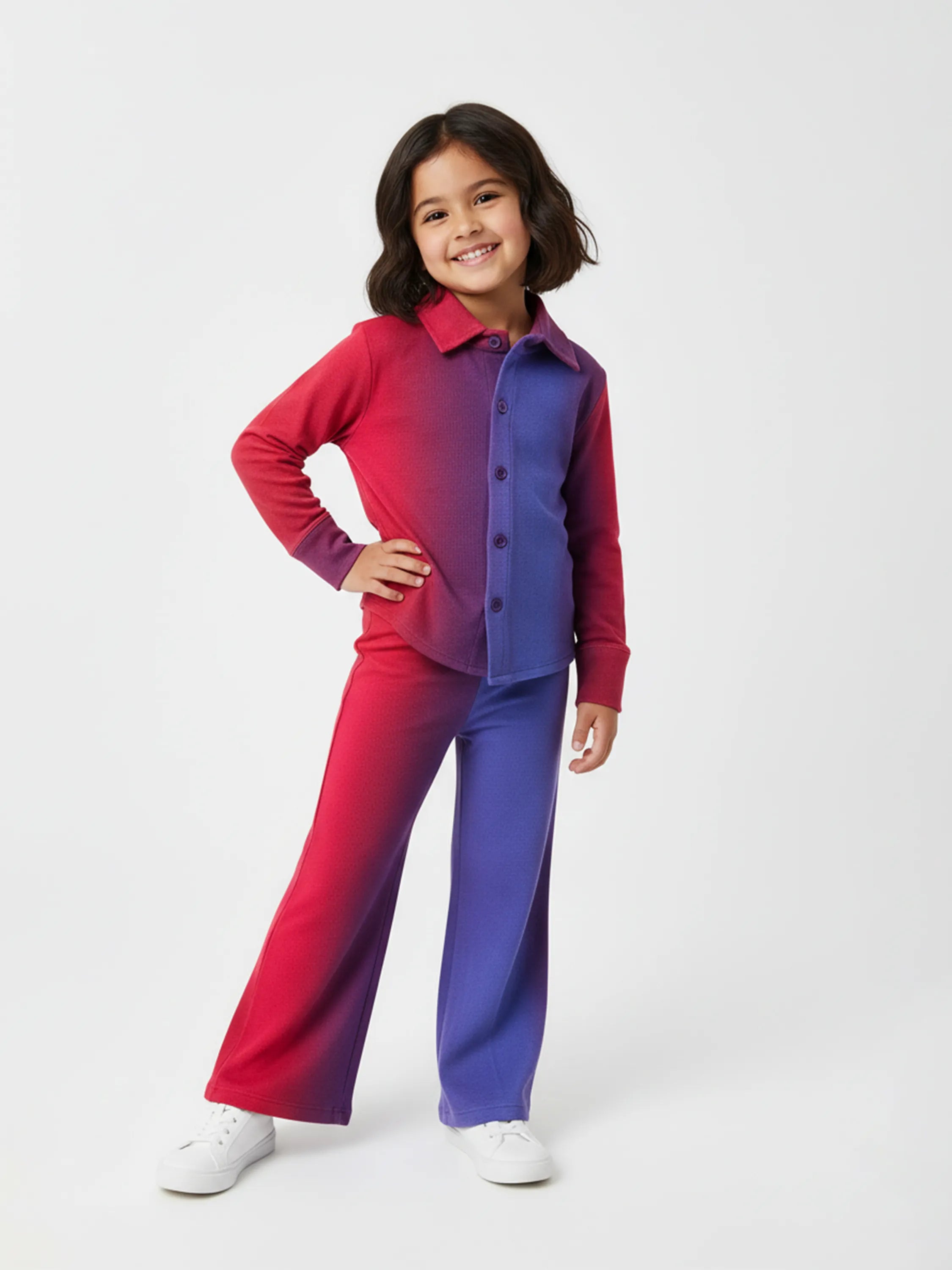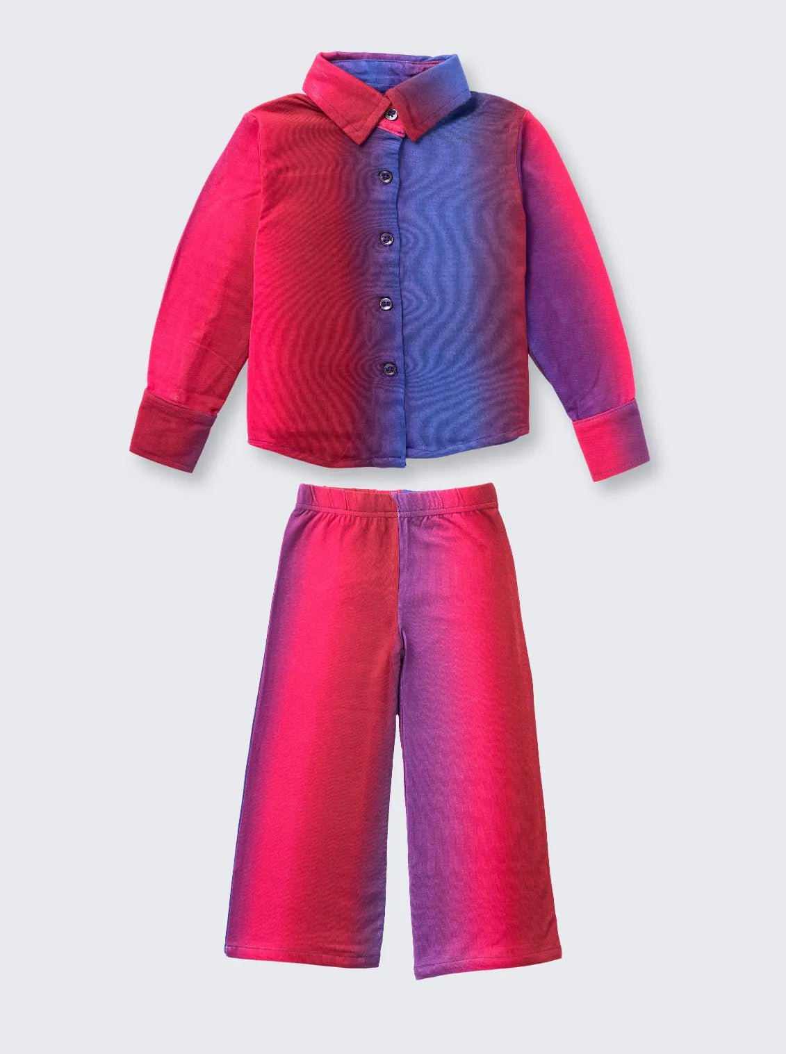 Turn up the style with this vibrant dual-shaded co-ord set in rich pink and blue tones! Designed to keep your little fashionista comfy yet ultra-trendy, this collared shirt and wide-leg pant combo is perfect for parties, playdates, and everything in between.
