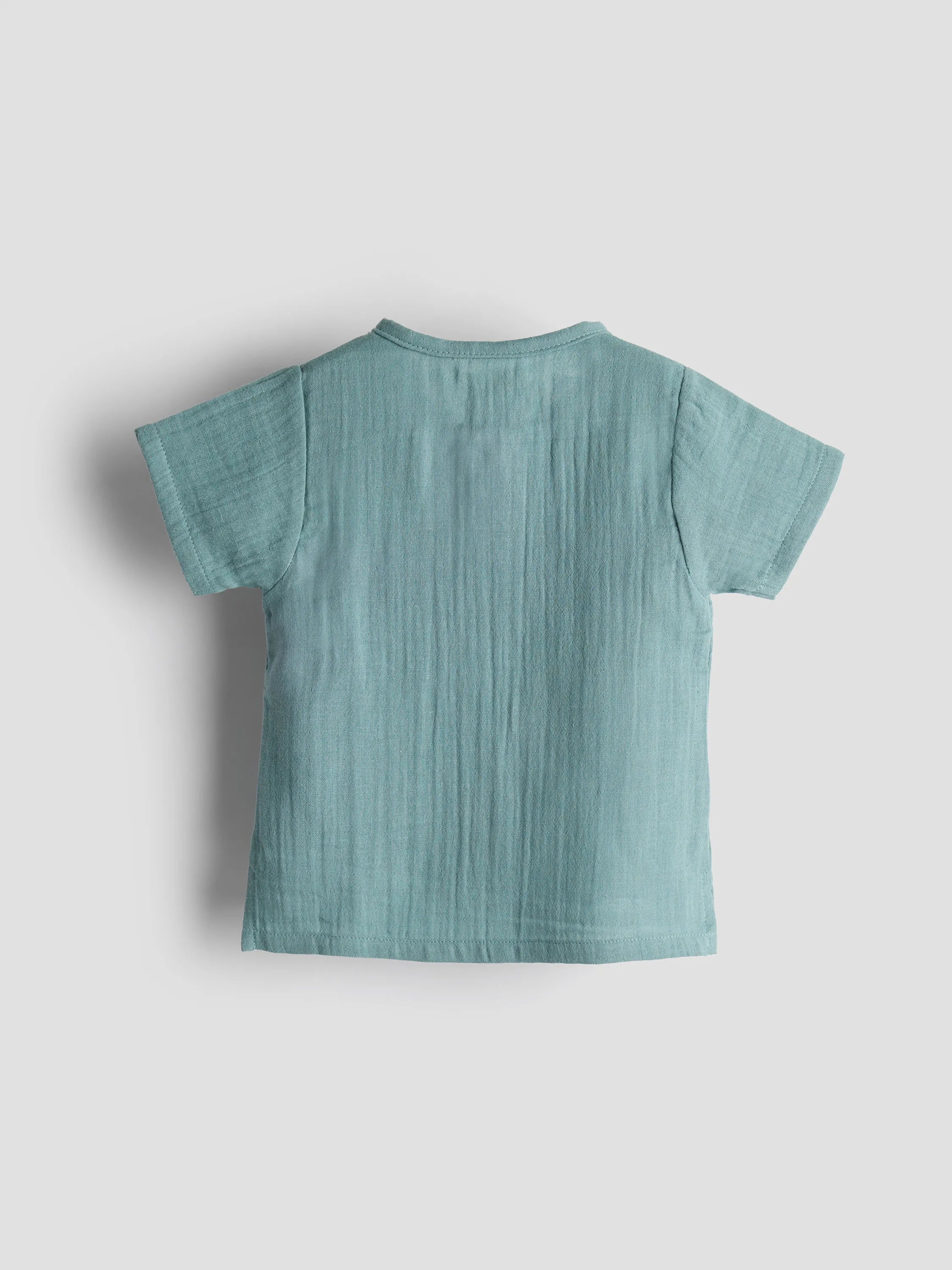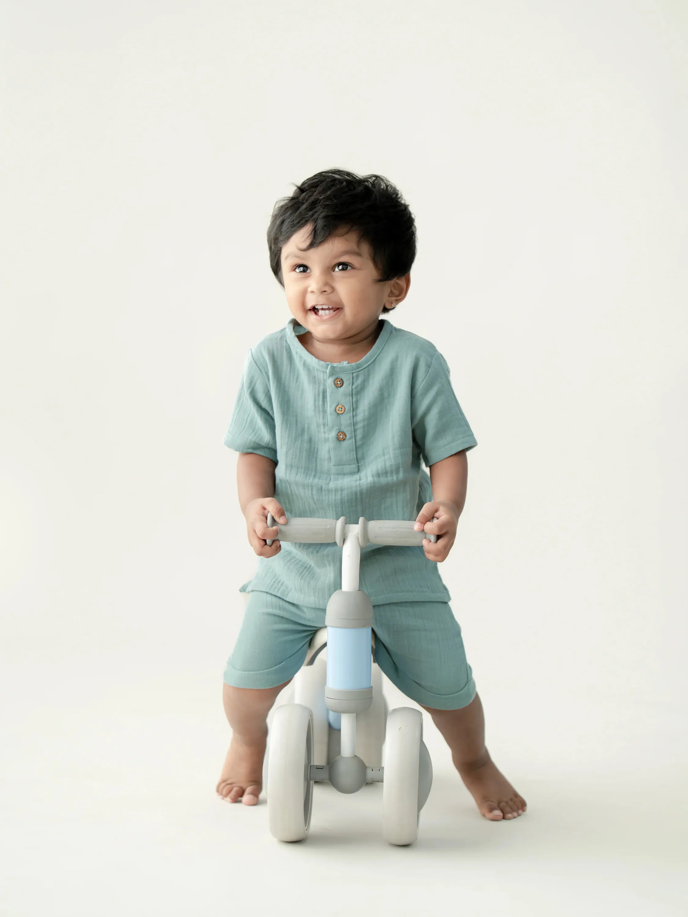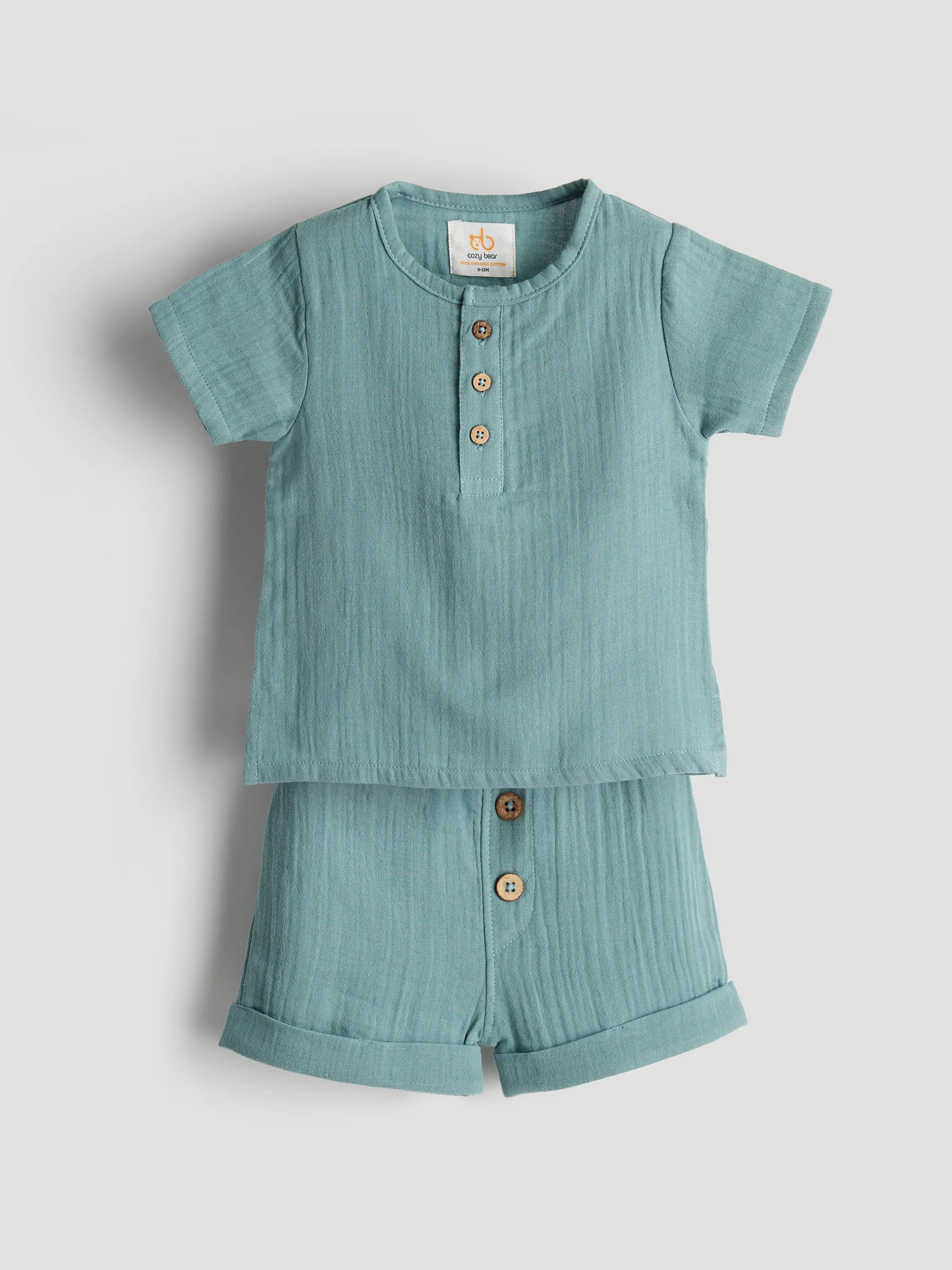 A breezy everyday essential in a soft sage hue, this co-ord set brings effortless comfort and classic charm to your baby’s wardrobe. Made from breathable GOTS-certified organic cotton muslin, it features a short-sleeve henley top with wooden buttons and airy shorts with mock buttons and a functional drawstring. Perfect for Kerala’s tropical days—whether it’s playtime, nap time, or a stroll with family.