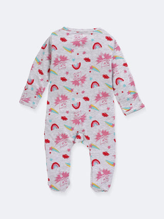 Full sleeve orange and grey rabbit pattern in white zipper sleepsuit with cap for baby