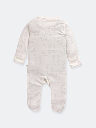 Full sleeve dotted & elephant pattern in cream zipper sleepsuit with cap for baby